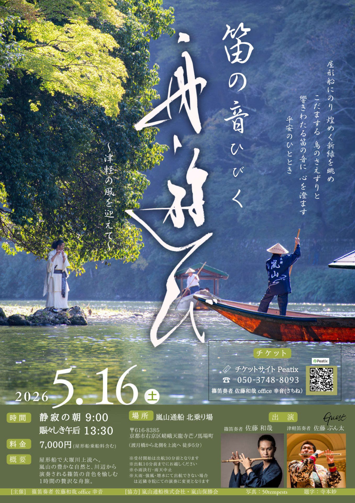 5月16日(土) 京都市 嵐峡にて『笛の音ひびく 舟遊び ~津軽の風を迎えて~』を開催いたします。